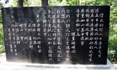 然而在日本,白居易的地位却是首屈一指,远非李、杜所能比拟。在平安朝,“文集”一词,甚至可以作为《白氏文集》的专有名词来使用;现今已普遍对古人直呼其名,而日本人却还称白居易为“白乐天”,称字不称名,在洛阳白居易墓,日文的献碑甚至比中文的都多,碑文竟将白居易誉为“日本文化的恩人”。