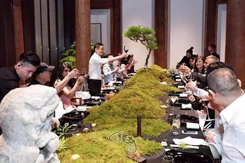 下图是马云请了一帮年青人临时在餐桌上用真土和草皮堆砌的所谓的园林-----招待各国首富和名人----不知谁会坐在石雕前?。。。。不谈美感---“园林”的土与食物没有间隔---就不怕不卫生?。。。