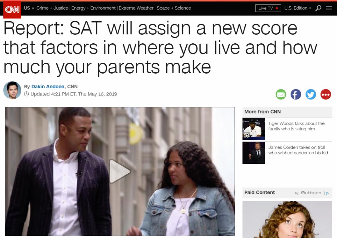 上个月中旬,CNN等媒体爆出,主管大学入学标准考试SAT的美国大学委员会(College Board),正准备推行一项新的改革:在不改变SAT考试的基础上,根据考生的社会及经济背景,为每个人另外打一个分数!