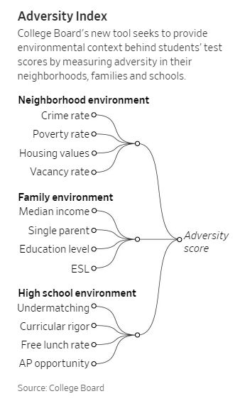 这项得分将和SAT考试分数一起,为美国本科院校挑选和录取新生提供参考。家庭条件、就读高中教育水平、所生活社区条件越差的学生,得分越高。而得分高的学生,如果考试成绩也不错,则可以被视为更加优秀。