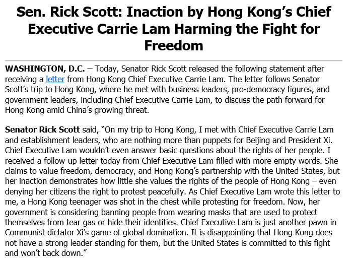 最近曾访港的美国参议员霍利周三在参议院表示:"今天当我们在一个安静的房间,和平安全地聚集时,我们必须记住,有一个城市,在半个地球之外,挣扎求存,有个城市正为人权自由而战,有个城市在威权统治的土地上孤独发光,这个城市叫香港。" pic.twitter.com/8jroYhq6h5
