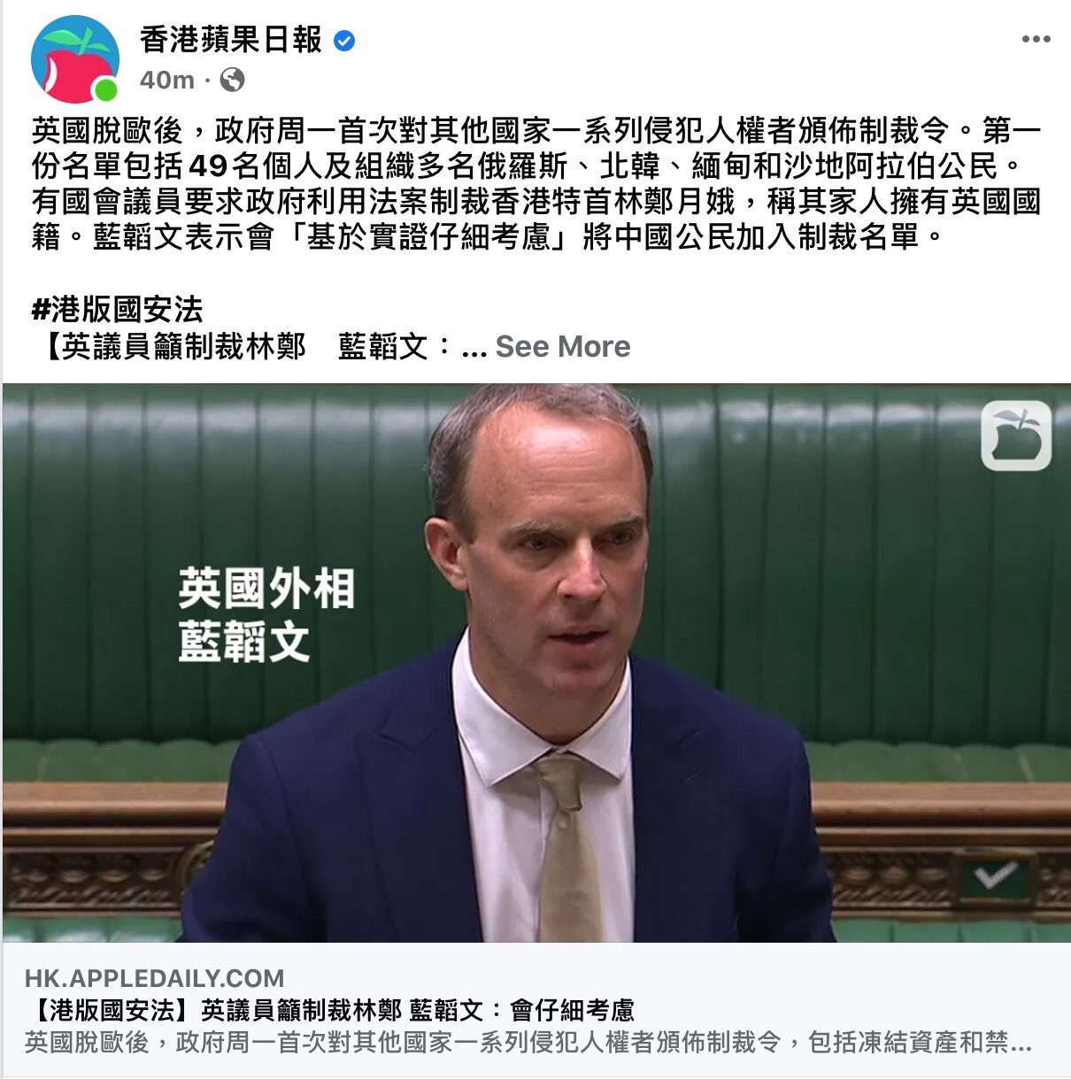 - @DominicRaab says the UK is extending its arms embargo on mainland China to Hong Kong.