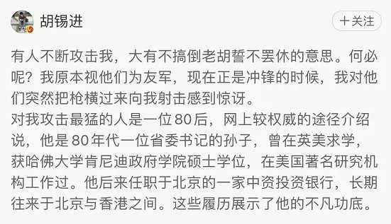 老胡只会被第二天的老胡打败,从没被其他人打败过。老胡立马发文澄清和反驳,硬中带软诉衷肠,先认清家门,把“兔主席”当做友军:“我原本视他们为友军,现在正是冲锋的时候,我对他们突然把枪横过来向我射击感到惊讶。”