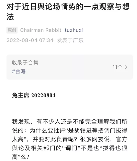 这次打佩洛西,我的话说得最重,我的那些话成为了推特上的热帖,在英语世界里广泛报道,成为了白宫和国防部劝佩洛西不要此时访台的主要依据之一,也成了美国部分主流舆论和战略学者反对佩洛西访问的理由之一。