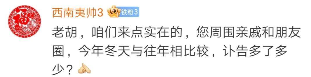 尽管胡锡进这次发文说的还算客观,但网友们还是持有自己的看法:“老胡,咱们来点实在的,您周围亲戚和朋友圈,今年冬天与往年相比较,讣告多了多少?”、“这都是你的成果呀,好好拿着吧”、“就这五万多全国都烧不过来?”、“6万会让全国的火化炉排不上号吗?这扯淡”、“只要是实事求是就行”。