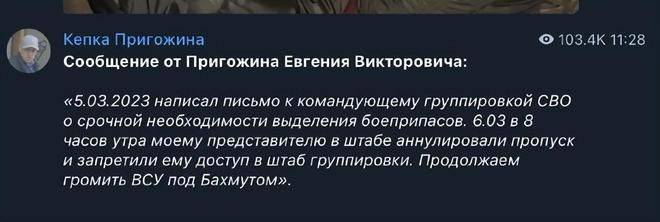 对巴赫穆特的乌军而言,除了有新的友军增援可以增强实力,还有就是俄军内部的内讧会导致敌人进攻势头的衰减。在经过水军倒闭民意,并亲自喊话获得了俄罗斯国防部提供的弹药申请后,瓦格纳集团老板普里戈津表示,他的代表被拒绝进入特别军事行动(NVO)总部,他在电报发文称: