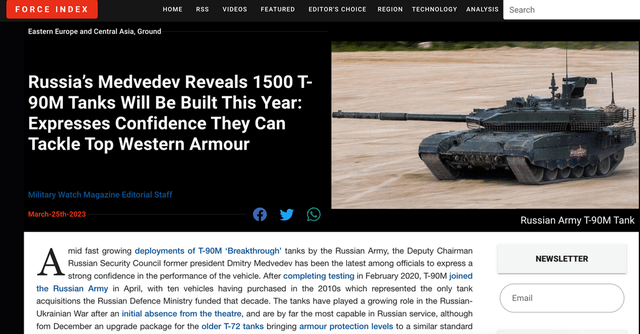 有人指出梅德韦杰夫其实搞错了,1500这个数字的含义,其中只有几百辆是新造的T-90M,其他是用老款坦克翻新改造的。如果按照这样的说法,再考虑到苏联给俄罗斯留下的庞大坦克库存,那么一年能拿出1500辆坦克送到前线部队手里,还是一个可以相信的数字。