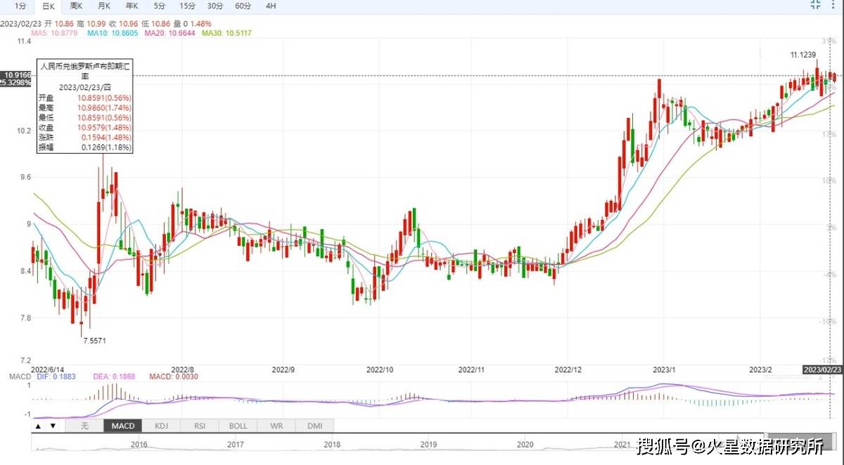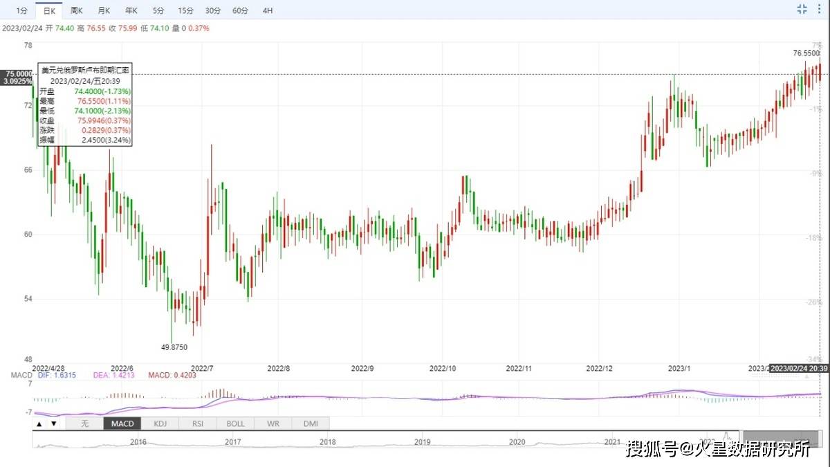 2月24日的俄罗斯《生意人报》报道说,在2月24日莫斯科外汇交易中心,外汇对卢布的汇率,持续上涨。其中美元升至 75.9946 卢布,欧元升至 80.382 卢布,2023年以来分别上涨了8.6%和5.4%。 这两个数值都是2022年4月以来的最高值。人民币汇率自2月20日创下1:11.1239的高点后略有回落,24日为10.9436,比年初上涨了4.1%,仍然站在2022年4月以来的较高位。