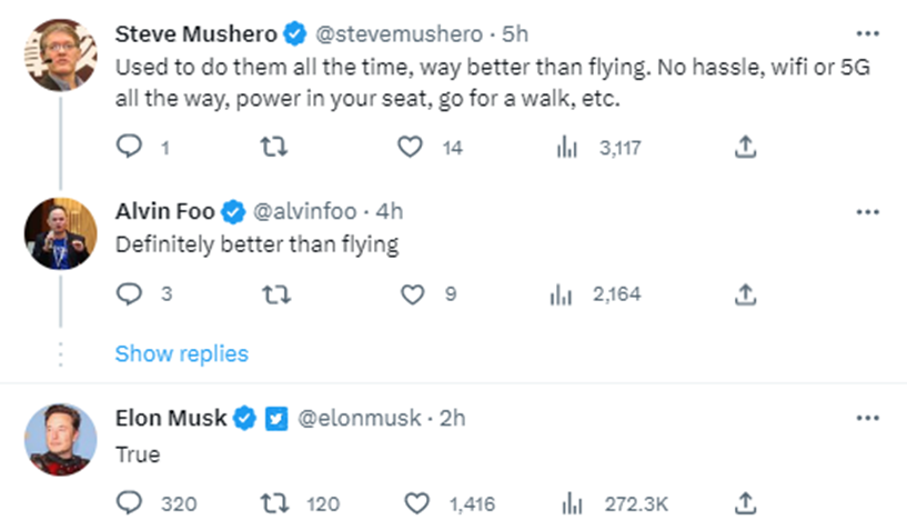 这则帖子在评论区引发不少网友的共鸣。推特用户史蒂夫·穆谢罗(认证为首席技术官、有多年在中国运营云计算创业公司经历)就评论称,“(我)过去一直这样做,比坐飞机好多了。不麻烦,一路都有 wifi 或 5G网络,座位上有电源,还能散散步等”。