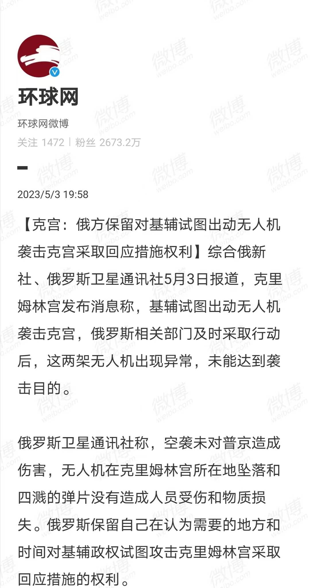 俄罗斯卫星通讯社称,空袭未对普京造成伤害,无人机在克里姆林宫所在地坠落和四溅的弹片没有造成人员受伤和物质损失。俄罗斯保留自己在认为需要的地方和时间对基辅政权试图攻击克里姆林宫采取回应措施的权利。