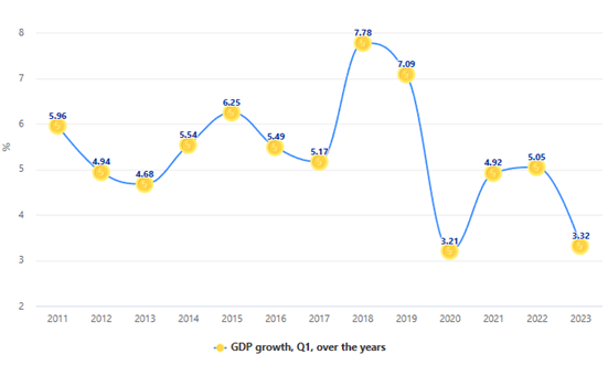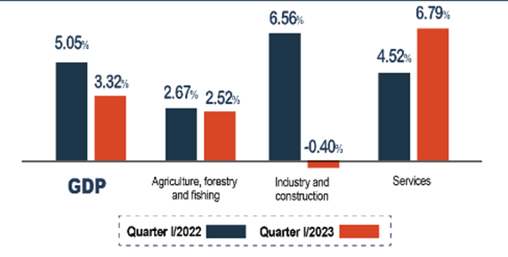 2023年1季度,越南GDP增速超预期下滑至3.32%,较2022年同期的GDP增速(5.05%)明显放缓,且大幅低于市场预期的4.8%的GDP增速。3.32%,是越南十二年以来第二低的一季度数据。