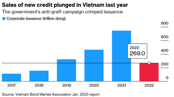 从数据来看,2022年越南房地产企业发行新债的总额只有269万亿越南盾,较2021年同比大幅下降了64%左右。