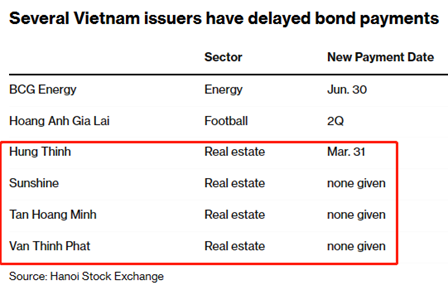 其中,越南第二大房地产开发商No Va Land Investment Group就在2023年2月表示,将推迟偿还到期的1万亿越南盾(4200万美元)短期票据,并希望持有人展期或将本金转换为其房地产产品。此外,Hung Thinh 、sunshine等地产公司也均已推迟其债券支付期限。