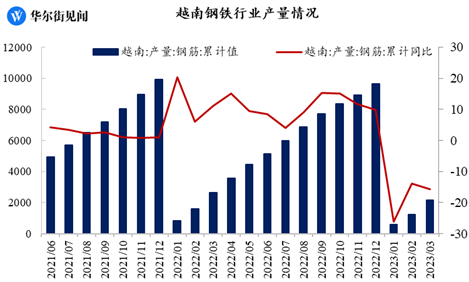 其中,以钢铁行业为例,由于房屋的开发建设需要使用到大量的钢材,地产用钢占到了钢材整体消费的50%以上,故房地产行业的发展与钢铁业的发展息息相关。可以看到,在越南房地产行业暴雷后,其钢铁行业就受到了较严重的影响。据越南统计局数据,截至2023年3月,越南钢筋产量为214.6万吨,同比大幅下降了15.76%。