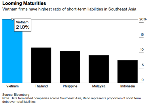 整体来看,越南的反腐行动像是一根导火索,直接引爆了其房地产市场,导致越南房地产企业流动性枯竭,进而对其整体行业造成了严重的冲击。据Bloomberg数据,目前越南房地产企业的短期负债率已经快速攀升至21%,是东南亚地区最高的水平。