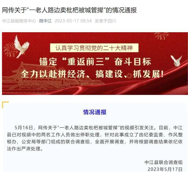 5月17日,据“微中江”微信公众号:5月16日,网传关于“一老人路边卖枇杷被城管撵”的视频引发关注。目前,中江县已对视频中的两名工作人员做出停职处理,针对此事成立了由纪委监委、作风整顿办、公安局等部门组成的联合调查组,全面开展调查,并将根据调查结果依纪依法作出严肃处理。