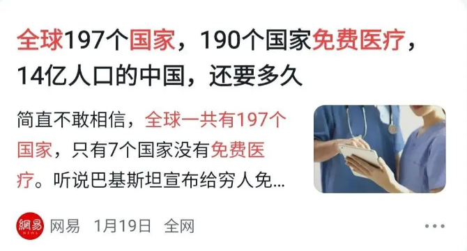 根据网上大量存在的公开信息,全世界197个国家一共有190个国家实行免费医疗,甚至印度和巴基斯坦都是免费医疗,全球不给国民提供免费医疗的国家仅有7个,我们中国大陆就是这7个之一。