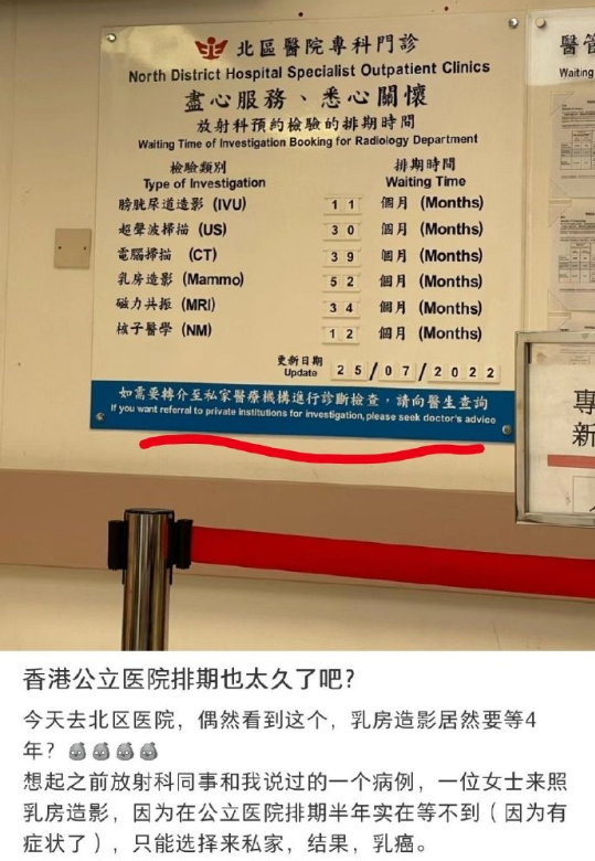 算一算,香港居民如果身体不适,只需要花费半年到三四年不等的时间就可以成功门诊,再花费一年到四五年不等的时间就可以成功做完检查,再花费三年左右的时间就可以成功安排手术去切除癌细胞了。
