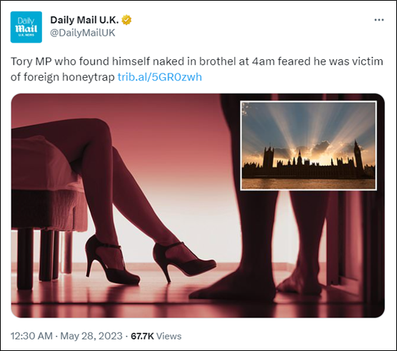 这位议员对媒体称,他目前担任的职务是对手英国工党希望在下届选举中极力争取的,由于身份敏感,他不愿意透露自己的姓名。他称,在4月的一天凌晨醒来后,发现自己躺在伦敦市一家肮脏破旧的妓院里,衣服也不翼而飞。他怀疑自己前一天晚上喝的饮料被人下了药,然后被扔到了这个妓院。为了脱身,他赶紧让保守党一位高级官员来把自己救了出去。