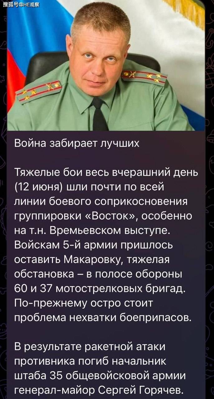 包括俄罗斯军事博主在内,多个消息源称,俄军第35集团军参谋长谢尔盖·戈亚切夫少将死于乌军导弹袭击。