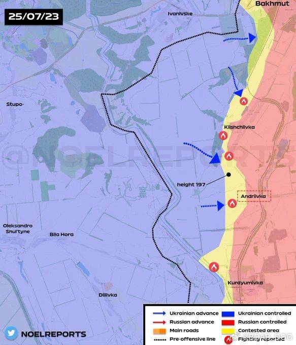 7 月 25 日发布的地理定位地图显示,乌克兰军队在巴赫穆特西南 7 公里的克列谢耶夫卡取得了重大战术进展,俄军退守村北面的阵地。