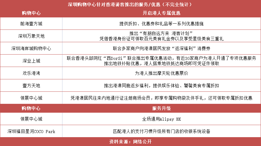 港客反向消费,深圳购物中心闻风而动。据铱星云商不完全统计,自深港两地通关以来,至少有7家深圳购物中心面向香港游客推出专属服务/优惠,吸引了不少港客前往消费。