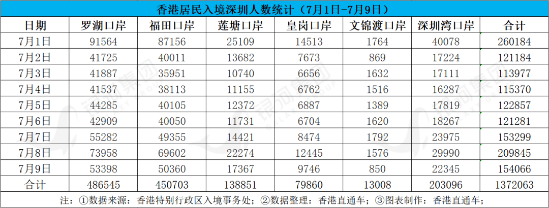 据@香港直通车,7月1日-7月9日,香港居民入境深圳人数累计达到137万人之多(下图);而内地居民入境香港人数累计47万人(上图)。