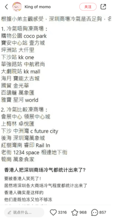 在深圳逛出一定心得的香港人,还根据自己的主观感受,整理出“深圳各大商场冷气程度名单”。