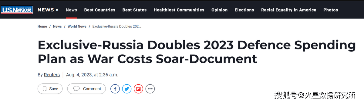 8 月 4 日USNews报道称,路透社审查的一份俄罗斯政府文件显示,莫斯科已将其2023年的国防开支目标翻了一番,达到超过1000亿美元,占所有公共支出的三分之一,因为乌克兰战争的成本螺旋式上升,给莫斯科的财政带来越来越大的压力。