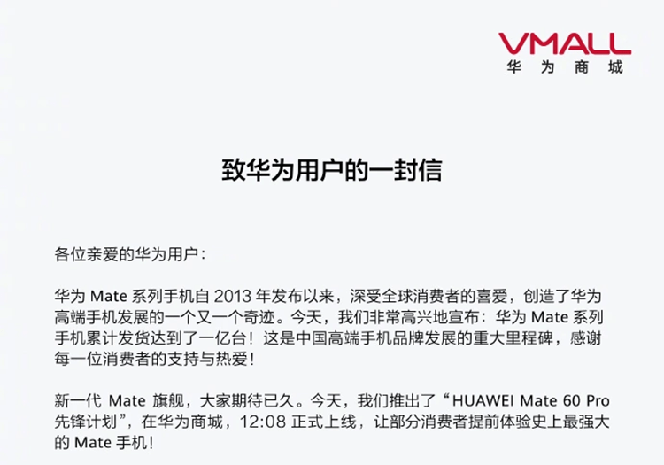 官方在“致华为用户的一封信”中提到,华为Mate系列手机累计发货量已经达到了一亿台,这是中国高端手机发展的重要里程碑。