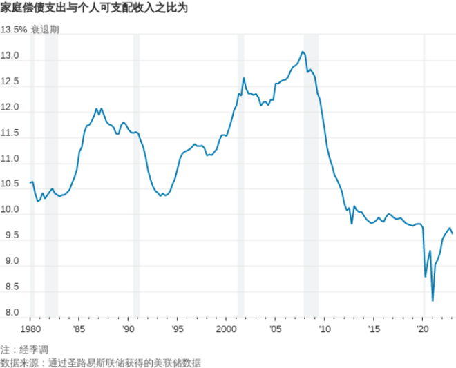 通常情况下,美联储加息会迫使债台高筑的消费者和企业控制支出,因为他们的贷款利息负担将随之加重。但消费者并未过度举债;第一季度,家庭偿债支出与个人可支配收入之比为9.6%,低于1980年至2020年3月疫情暴发期间的最低水平。