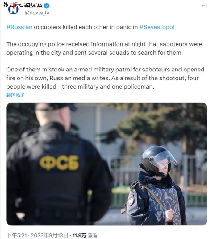 东欧地区最大的媒体NEXTA和开源网络情报(OSINT)显示,就在乌克兰导弹袭击当夜,塞外斯托波尔还发生了一些其他事:俄罗斯驻军和当地警察局收到情报,称有破坏分子在城内活动,多支小队被派去执行搜捕任务,但其中一人将一个军事巡逻队误当成了破坏分子,双方爆发激烈枪战,导致3名军人和1名警察死亡。
