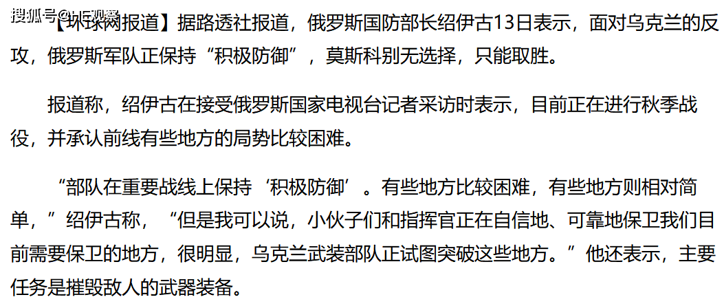 在接受“俄罗斯1号”电视台采访的时候,俄罗斯国防部绍伊古称俄军正保持“积极防御”,莫斯科别无选择,只能胜利。但与此同时,绍伊古也承认,前线某些区域的局势很困难,“军队正在必要的、重要的战线上保持积极防御,在一些地方比较困难,在另一些地方则相对容易。”