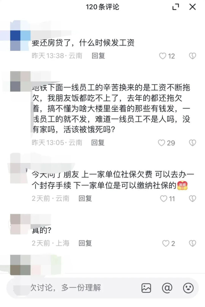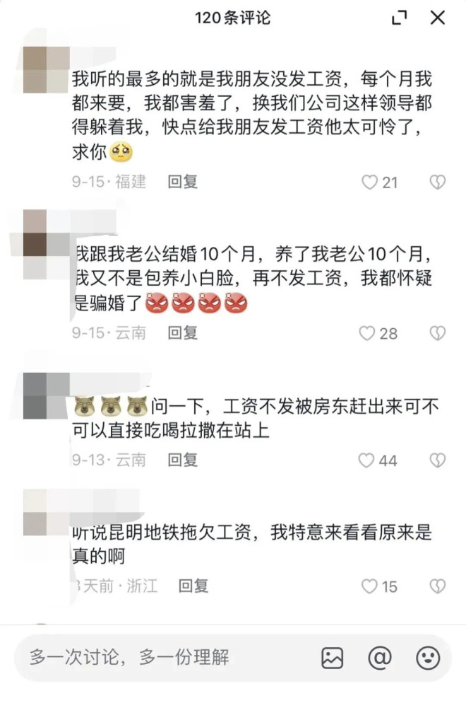 继国内多地公交公司暴雷引发欠薪停运等现象后,最近这两天,昆明地铁官方社交平台账号的视频评论区下方沦陷了,涌现出大量员工和家属讨薪的评论: