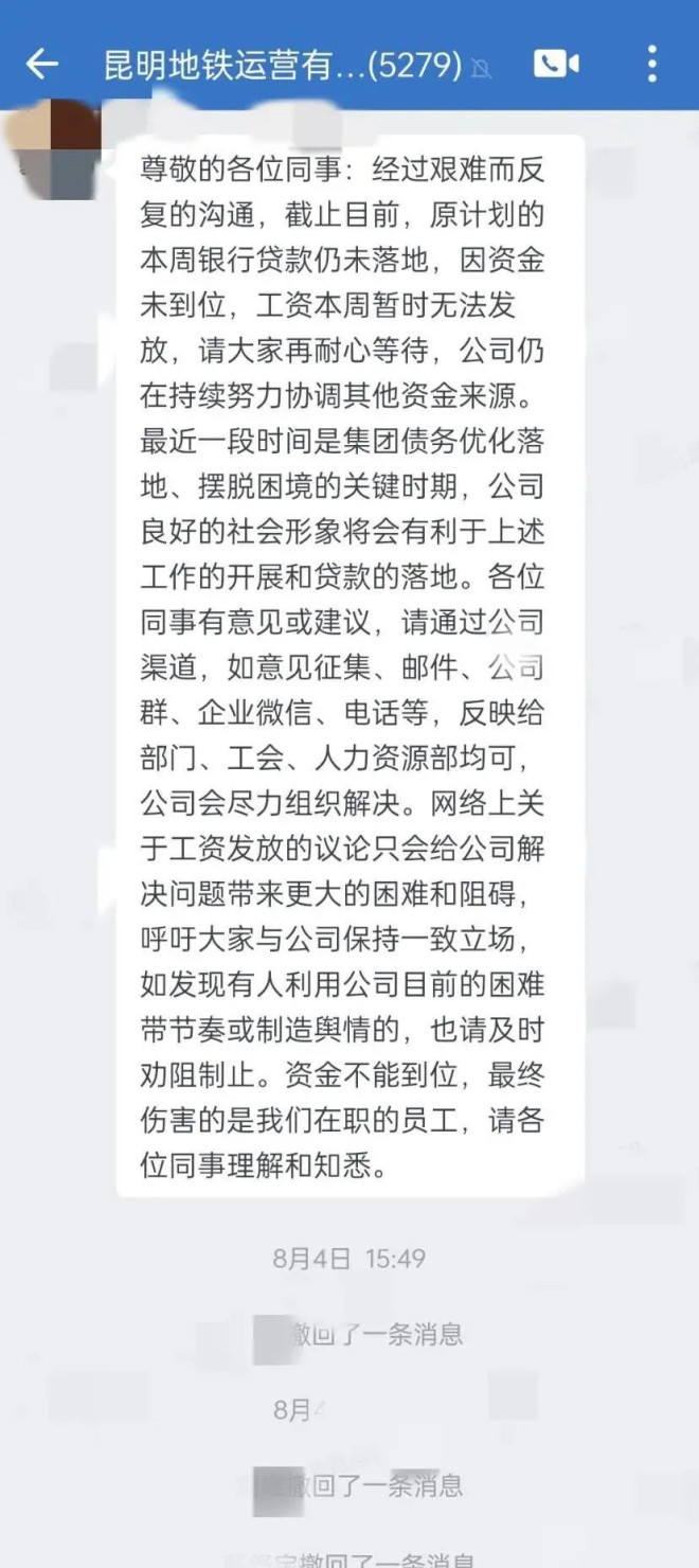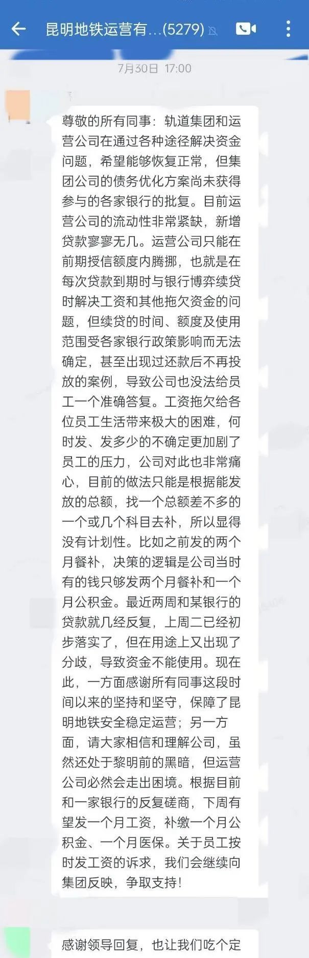 他还给笔者发来两份昆明地铁公司企业微信的截图,这两份截图内容显示均是同一人发布,成员显示为5279人。其中,第一份截图发布的时间显示为7月30日,主要内容为,轨道集团和运营公司在通过各种途径解决资金问题,希望能够恢复正常,但集团公司的债务优化方案尚未获得参与的各家银行的批复。
