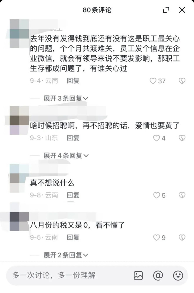 这位领导还提到,员工有意见或建议,请通过公司渠道反映,“网络上关于工资发放的议论只会给公司解决问题带来更大的困难和阻碍,呼吁大家与公司保持一致立场,如发现有人利用公司目前的困难带节奏或制造舆论的,也请及时劝阻制止。”
