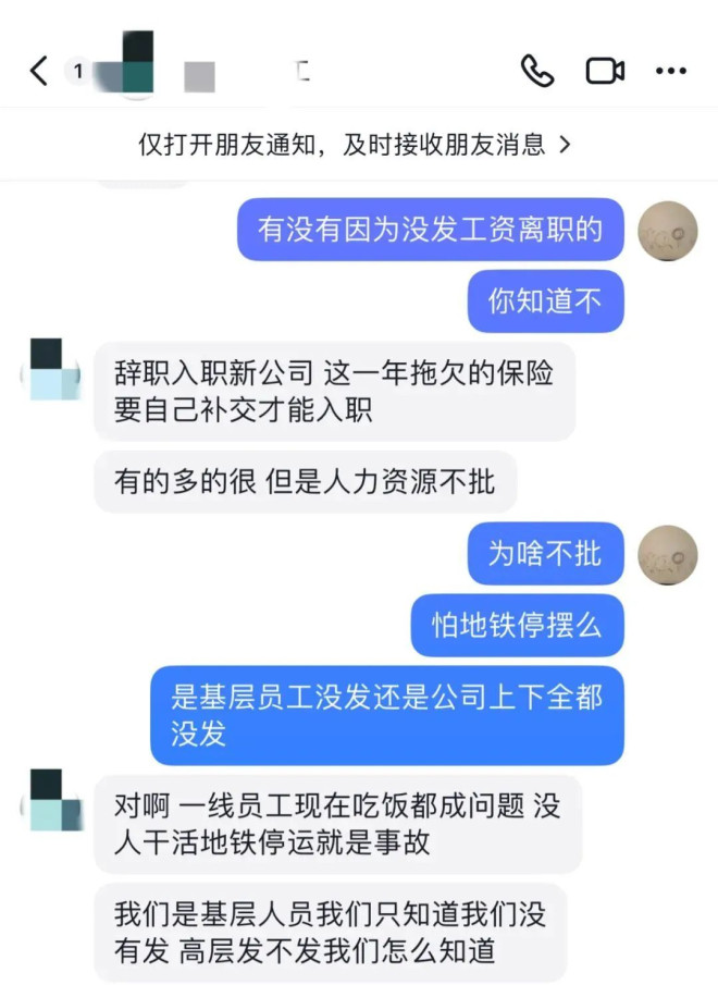 这名员工还称,即便员工选择劳动仲裁了也没用,因为公司没钱。而且很多员工提出离职,但人力资源不批,“一线员工现在吃饭都成问题,没人干活地铁停运就是事故。”