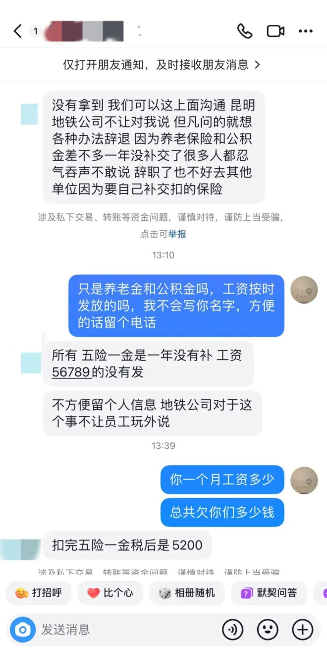 今天,笔者联系到一名自称是昆明地铁公司正式员工的人员,据其介绍,他的工资每月扣完五险一金税后是5200元,从今年5月份开始工资拖欠至今没有发,五险一金有一年时间没有交,“整个地铁公司有5000多职工,还不算劳务派遣;地铁公司对于这个事,不让员工外说。”