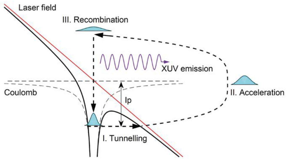 高次谐波的基本性质可以用半经典的三步模型理论来解释,如图1所示:首先在超快激光场的作用下,电子通过被强激光场压低的势垒隧穿电离离开原子;然后电子在光场中被进一步加速;最后部分电子被反向推回母核并与母核复合,释放波长覆盖从极紫外至软X射线辐射的范围的高次谐波光子。