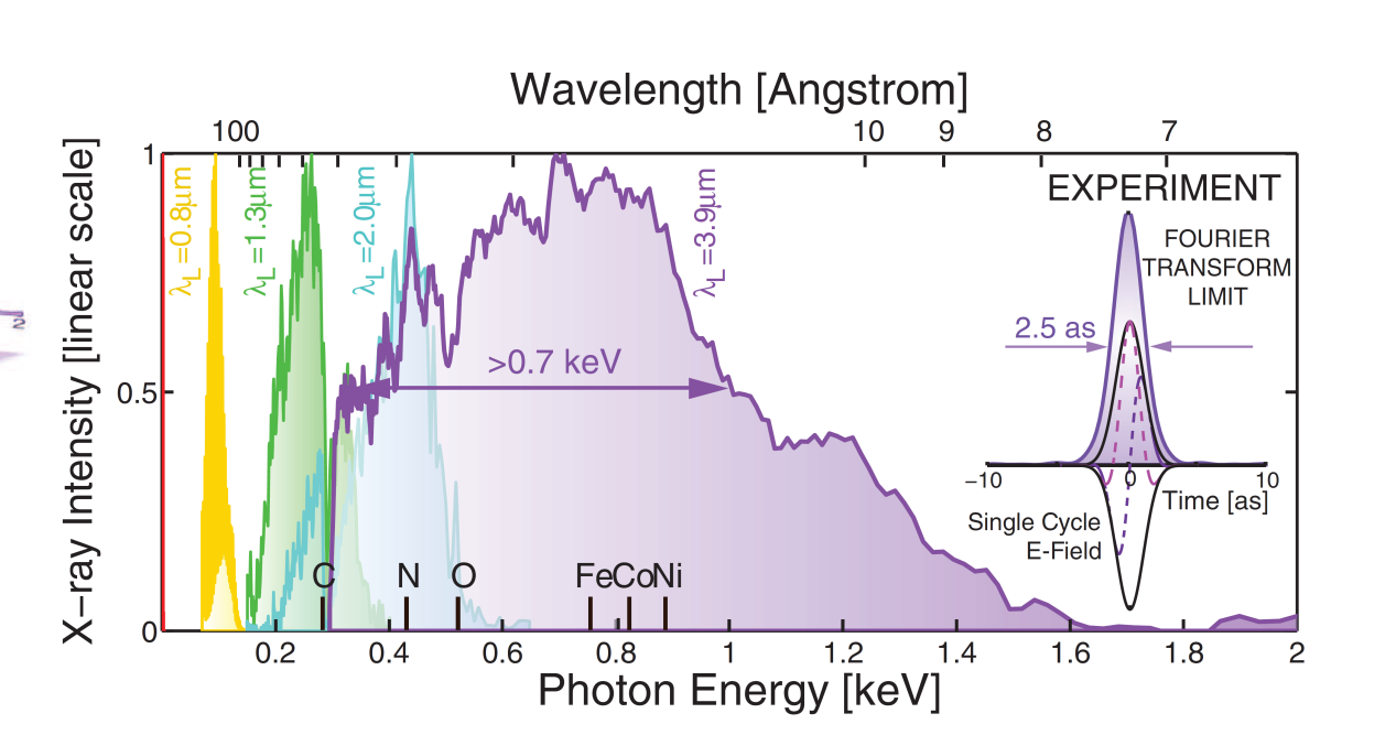 2017年,美国中佛罗里达大学的Z.Chang(常增虎)用中心波长为1.8 μm的双周期飞秒放大激光,得到了53 as的孤立阿秒脉冲,其光子能量达到碳K吸收边缘(284 eV) 。