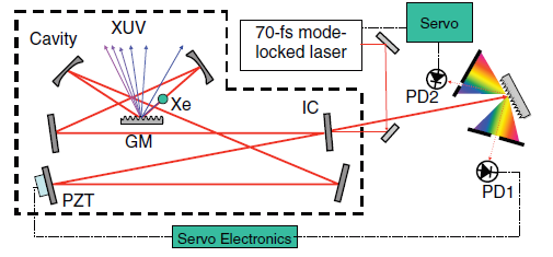 对于更高重复频率的高次谐波装置,利用提升气压满足相位匹配非常困难。该类系统可行的方案是使用共振增强腔,使高次谐波产生的源位于一个谐振腔的内部,通过驱动光源在腔内的振荡,提升腔内电场强度,可以实现在极紫外波段的频率梳,如图4所示。