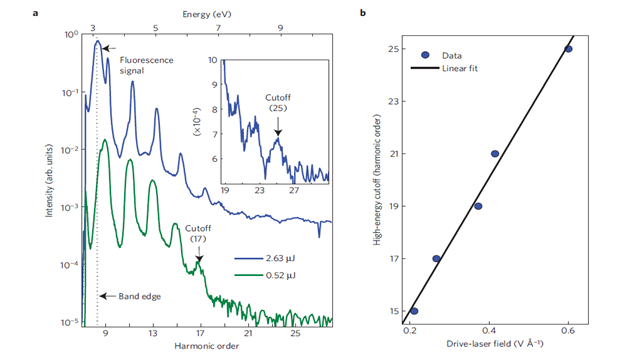 虽然早在90年代就已经在理论上得到预言,但直到2010年,人们才第一次在500 μm的ZnO 晶体中得到高次谐波信号,激光参数为3.25 μm,100 fs,1 kHz,聚焦后的功率密度约为5×1012 W/cm2,产生截止区25阶(9.5 eV)的高次谐波,如图5所示。