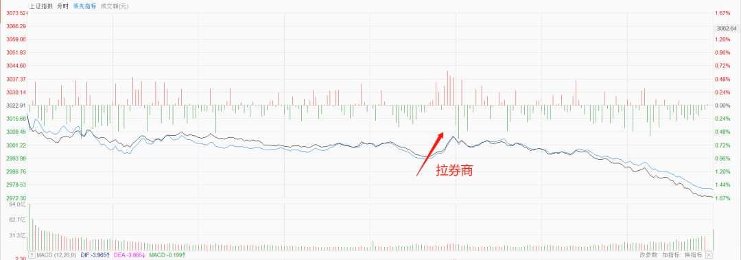 昨天刚聊到0.76%距离的3000点保卫战,今天一下子就破了,跌幅远比0.76%多的多,收盘跌幅1.67%,期间就拉了下券商稍微抵抗一下,不过没有用,破的很丝滑,4600家下跌。