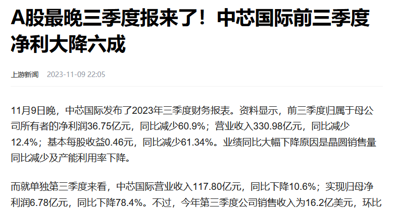 数据显示,中芯国际前三季度营收330.98亿元,同比下降12.4%,净利润为36.75亿元,同比下降60.9%;