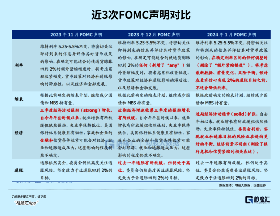 此外,会议声明与12月有几处不同。第一,政策指引方面,删除“额外紧缩幅度”。第二,在政策考虑因素方面,从此前的“累计紧缩幅度、政策影响的滞后性、经济和金融发展”修改为“最新数据、前景变化、风险平衡”。