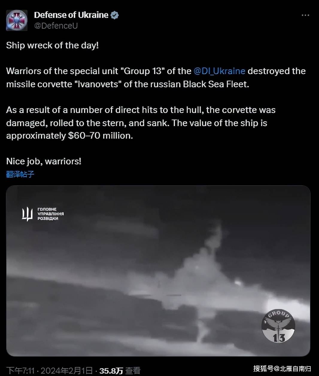 这次被击沉的“伊万诺维茨”号导弹艇,位于克里米亚多努兹拉夫湖停泊处,受到无人艇多批次撞击后严重受损,船体倾斜很快就进水沉没。乌克兰国防部情报总局同步发布视频,也表彰了执行任务的乌克兰士兵,认为该船至少价值6000-7000万美元,和损失几艘无人艇相比战果当然很丰富。
