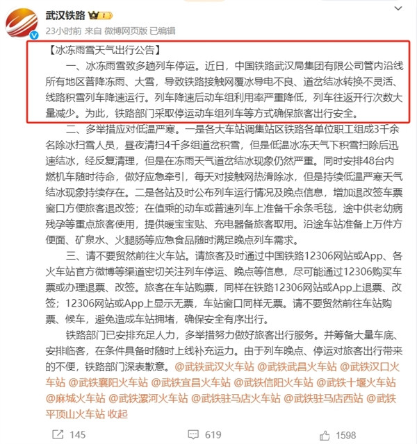 昨天,武汉铁路发了一份【冰冻雨雪天气出行公告】,提到了三个不利因素:
