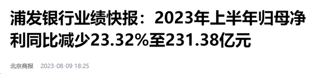 2023年8月9日,浦发银行发布的2023年半年度业绩快报显示,2023年上半年,浦发银行实现营业收入912.3亿元,同比下降7.52%;归母净利润231.38亿元,同比下降23.32%。