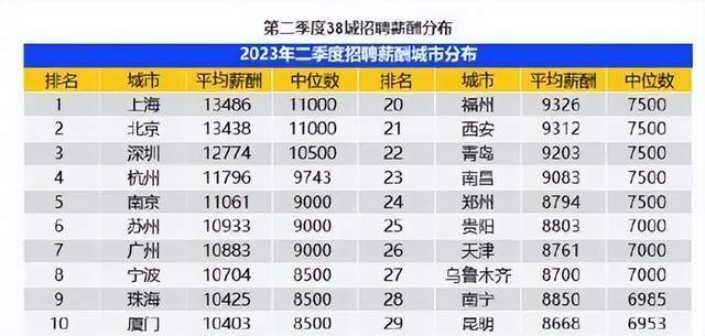 智联招聘发布的2023年二季度《中国企业招聘薪酬报告》显示,全国38个核心城市中,二季度上海继续位居榜首,平均招聘月薪13486元;北京次之,平均月薪13438元;深圳以12774元处于第三位。