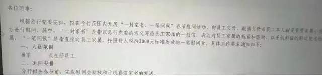 据了解,“一封家书”是指以浦发银行总行党委的名义写给员工家属的一封信,表达对员工家属的祝福和感谢,以手机彩信的形式发送。而“一笔问候”是指直接向员工家属,按照每人税后2000元标准发放的一笔慰问金。